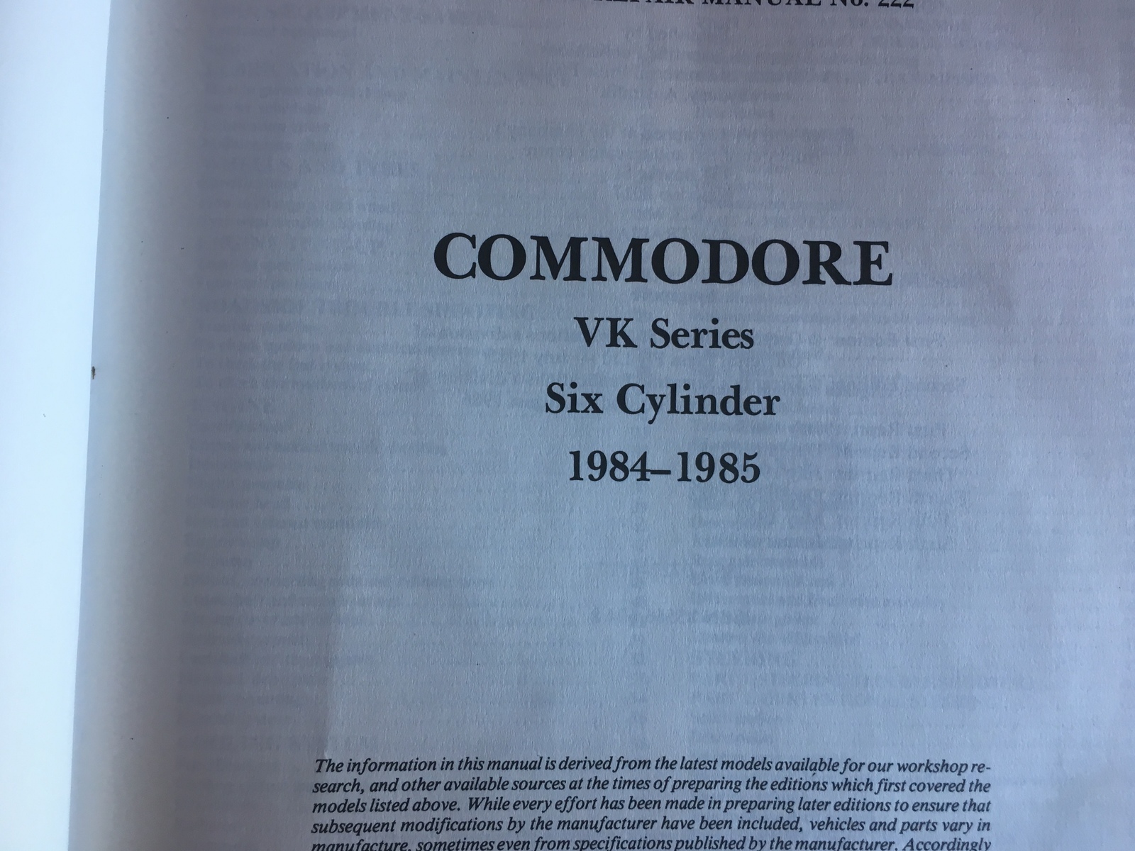 COMMODORE VK 6CYL 1984-1985 GREGORYS WORKSHOP SERVICE REPAIR MANUAL . MANUAL IN USED CONDITION MINOR WEAR HAS ALL SORTS OF HANDY INFORMATION ON SERVICING - OPERATION ETC ETC .MAYBE DIRTY ON COVER AND SOME PAGES FROM STORAGE ,USED OLD STOCK,MAY HAVE DIRTY OR TORN COVER OR PAGES FROM USE,LOOK AT PHOTOS THAT IS WHAT YOU WILL GET,